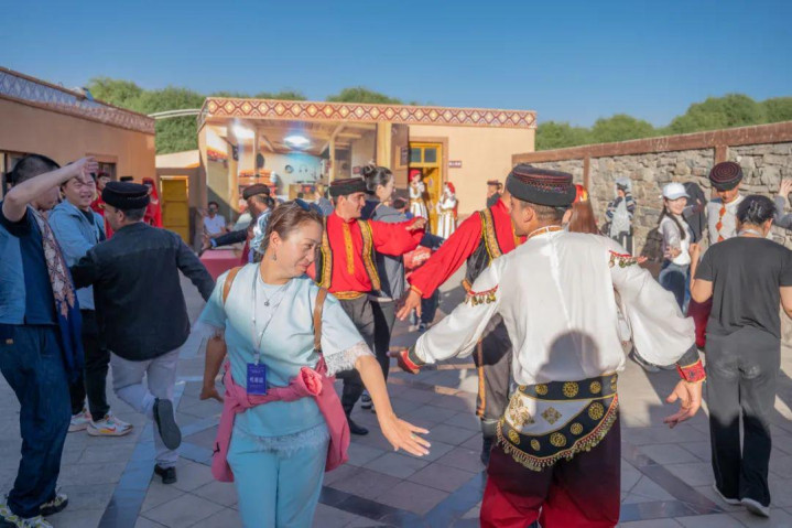 2025年国家金牌(优秀)导游一行与当地群众一同载歌载舞。喀什地区融媒体中心 实习记者曹宇婷 摄